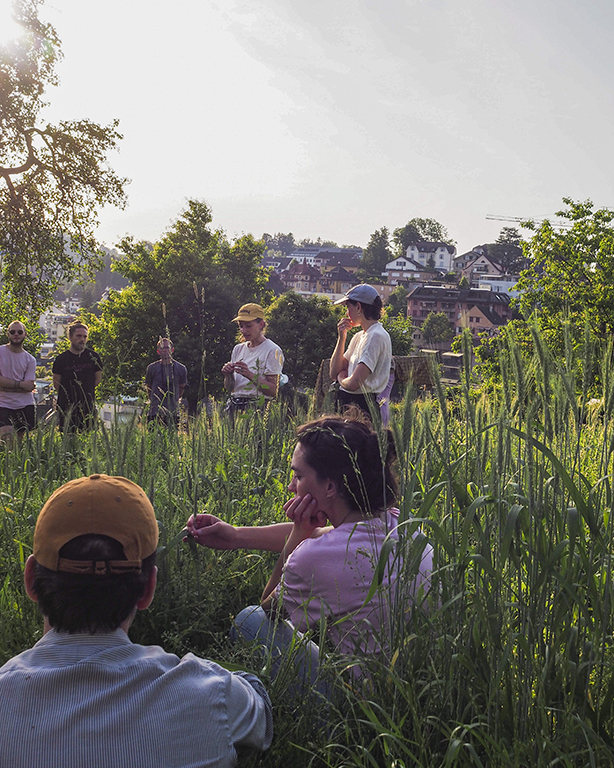 Brot kann als Zeitzeugnis der Menschheit gelesen werden: Die Rezeptur Mehl, Wasser, Zeit – und manchmal Salz, hat sich seit tausenden Jahren nicht verändert und wird es auch in Zukunft nicht tun. In der cake session #2 zu Alexandra Baumgartners Ausstellung «bread eaters chapter 1» besuchten wir das Weizenfeld der Künstlerin, auf dem sie als Feldversuch verschiedene Sorten anbaut. Bei einem Picknick diskutierte Baumgartner mit der Biologin und ehemaligen Weizenzüchterin Nicole Bischofberger über die verschiedenen Schritte in der Entwicklung einer neuen Weizensorte. Wie wird heute, angesichts einer sich verschärfenden Klimakrise und wachsendem Agrobiodiversitätsverlust, bestimmt, was morgen in unserem Brot steckt? Das Gespräch ermöglichte ein Blick hinter die Kulissen eines wenig bekannten Berufsfeldes und lud zum gemeinsamen Nachdenken über den Acker der Zukunft ein.