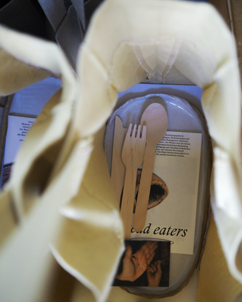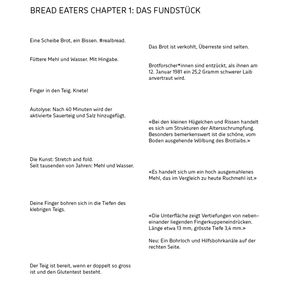 “bread eaters chapter 1” ist eine Momentaufnahme ihrer journalistisch dokumentarischen Untersuchung des Beziehungsgeflechts Mensch – Kulturpflanze. Sie ist als Dialog konzipiert und wagt als inszenierte Fundstelle einer Scheibe Brot den Versuch, etwas aus der Gegenwart als Zeitzeugnis in die Zukunft zu transportieren. Die Künstlerin erarbeitet mittels Befragungen, Beobachtungen und einem Feldversuch Zugänge zur Materie «Weizen» und das daraus stehende Brot. Denn das Konzept Mehl, Wasser, Salz (im besten Fall) hat sich seit Jahrtausenden nicht verändert und wird es wohl auch in Zukunft nicht tun.