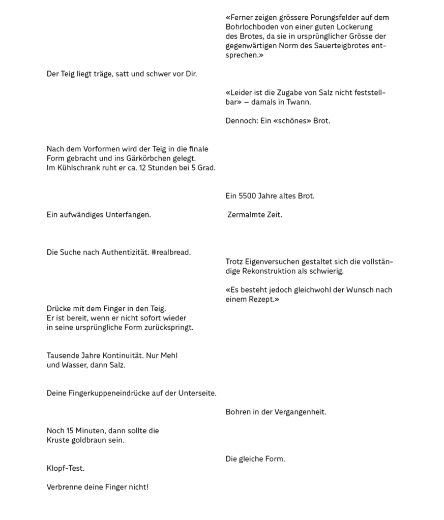 Alexandra Baumgartner (*1991, Zürich) untersucht das Beziehungsgeflechts Mensch – Kulturpflanze. Mittels Befragungen, Beobachtungen und einem Feldversuch erarbeitet die Künstlerin verschiedene Zugänge zur Materie «Weizen». Der Weizen und das daraus entstehende «Brot» – in dessen kulturgeschichtlichen Bedeutung die Begriffe Nahrung, Speise, Beschäftigung und Unterhalt widerhallen – werden dabei zu Instrumenten, mit welchen die Zukunft erforscht und imaginiert werden.